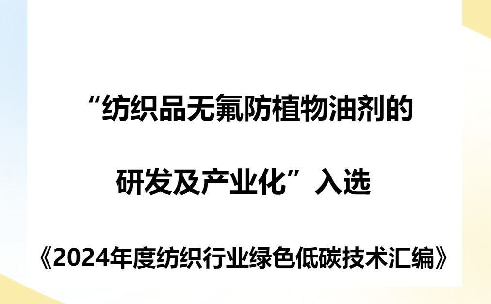 “纺织品无氟防植物油剂的研发及产业化”入选《2024年度纺织行业绿色低碳技术汇编》 12月5日,中国纺织工业联合会科技发展部与中国纺织工业联合会社会责任办公室联合编制的《2024 年度纺织行业绿色低碳...